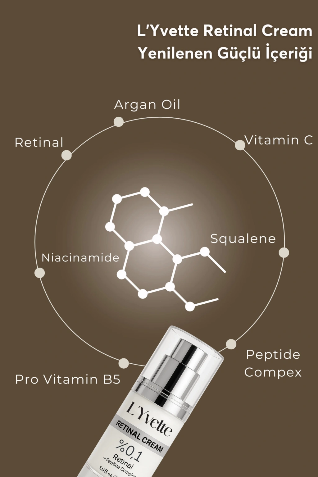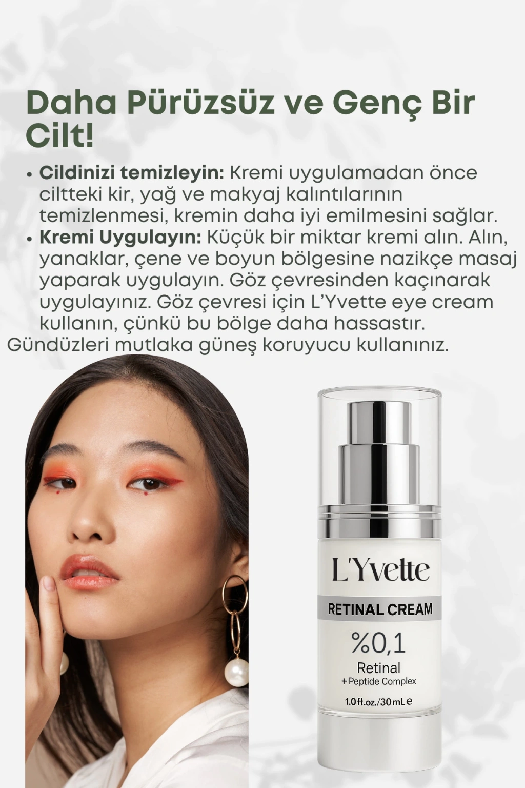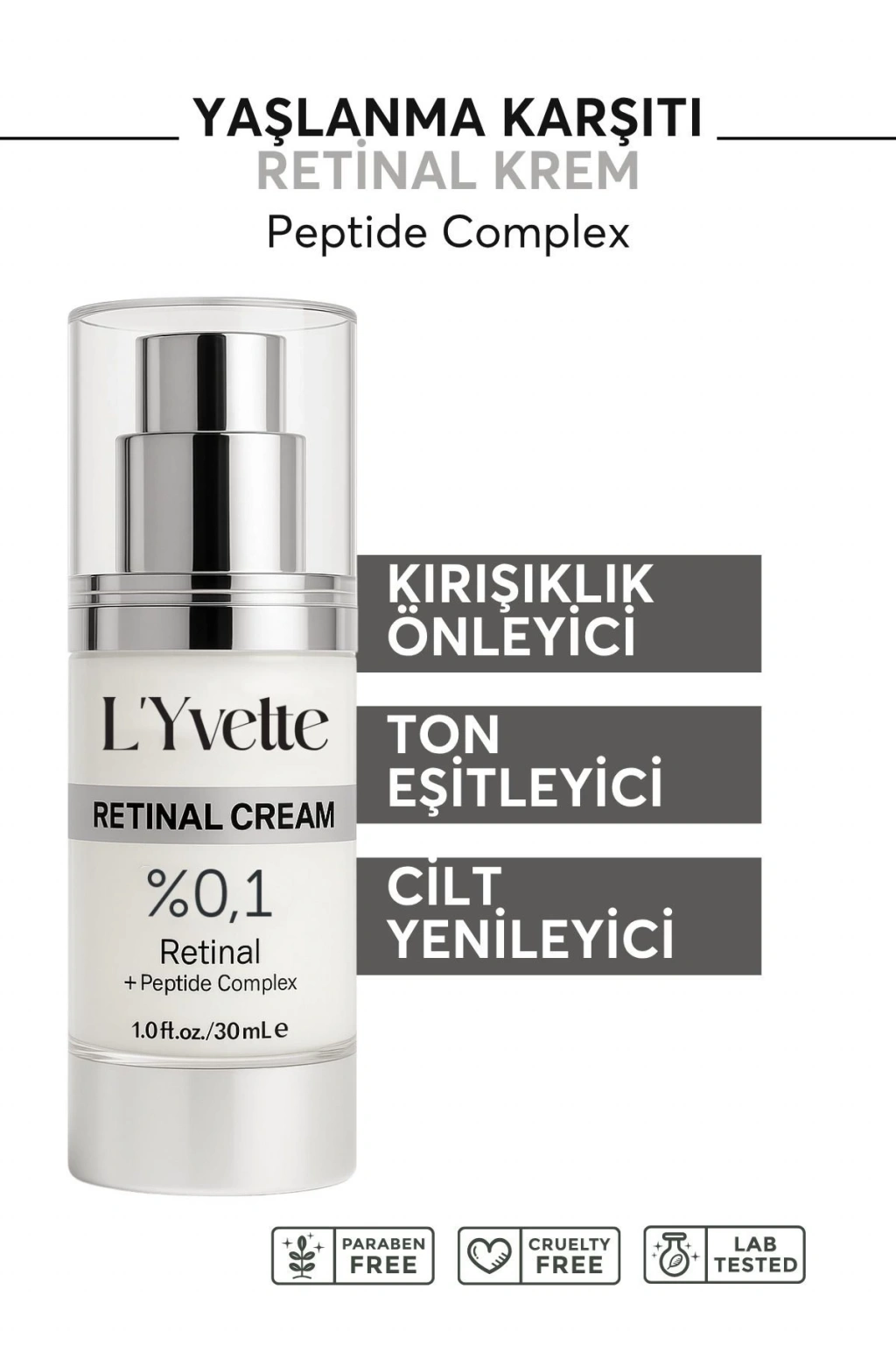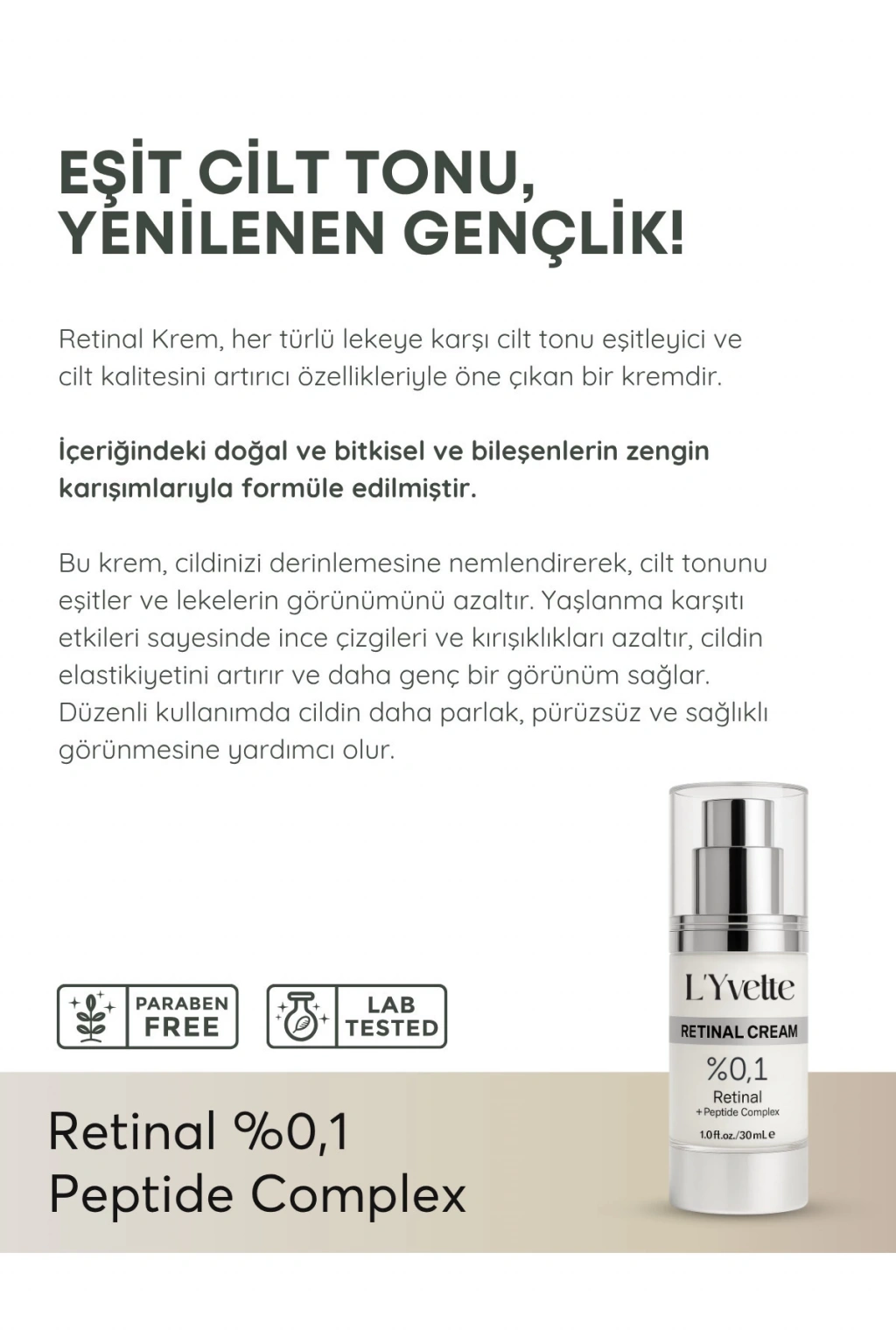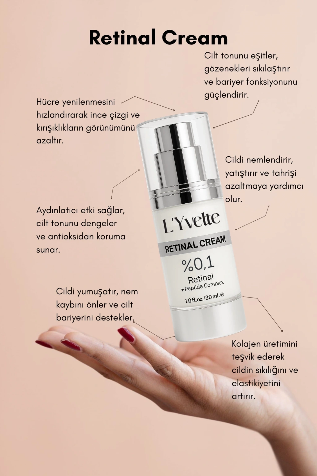 L'Yvette Retinal Krem Zamanla oluşan kırışıklık ve ince çizgilere karşı geliştirilmiş bu ileri seviye formül, yüksek etkili aktif bileşenleri ve temiz içerik prensibiyle cildinize saygılı, bilimsel bir bakım sunar. Cilt yenilenmesini destekleyen retinal ile kombine edilen niacinamide, peptit kompleksi ve vitaminler sayesinde cildin elastikiyetini artırır, ton eşitsizliğini azaltır ve ışıltılı bir görünüm kazandırır.