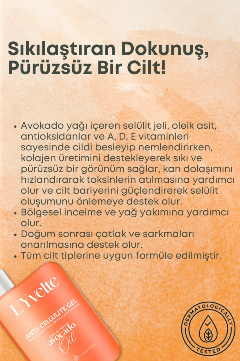 Unutmayın: Selülit görünümünü azaltmada düzenli ürün kullanımı, sağlıklı beslenme, su tüketimi ve egzersizle desteklenmelidir.